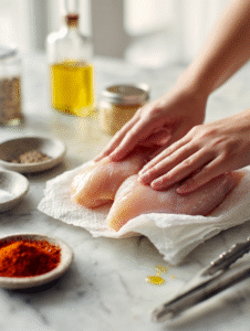 Step 1: Start with a fresh, skinless chicken breast. Pat dry with paper towels to remove excess moisture.