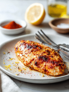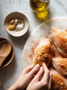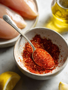 Step 2: Mix your favorite spices—paprika, garlic powder, and a pinch of cayenne. Rub generously over both sides of the chicken.