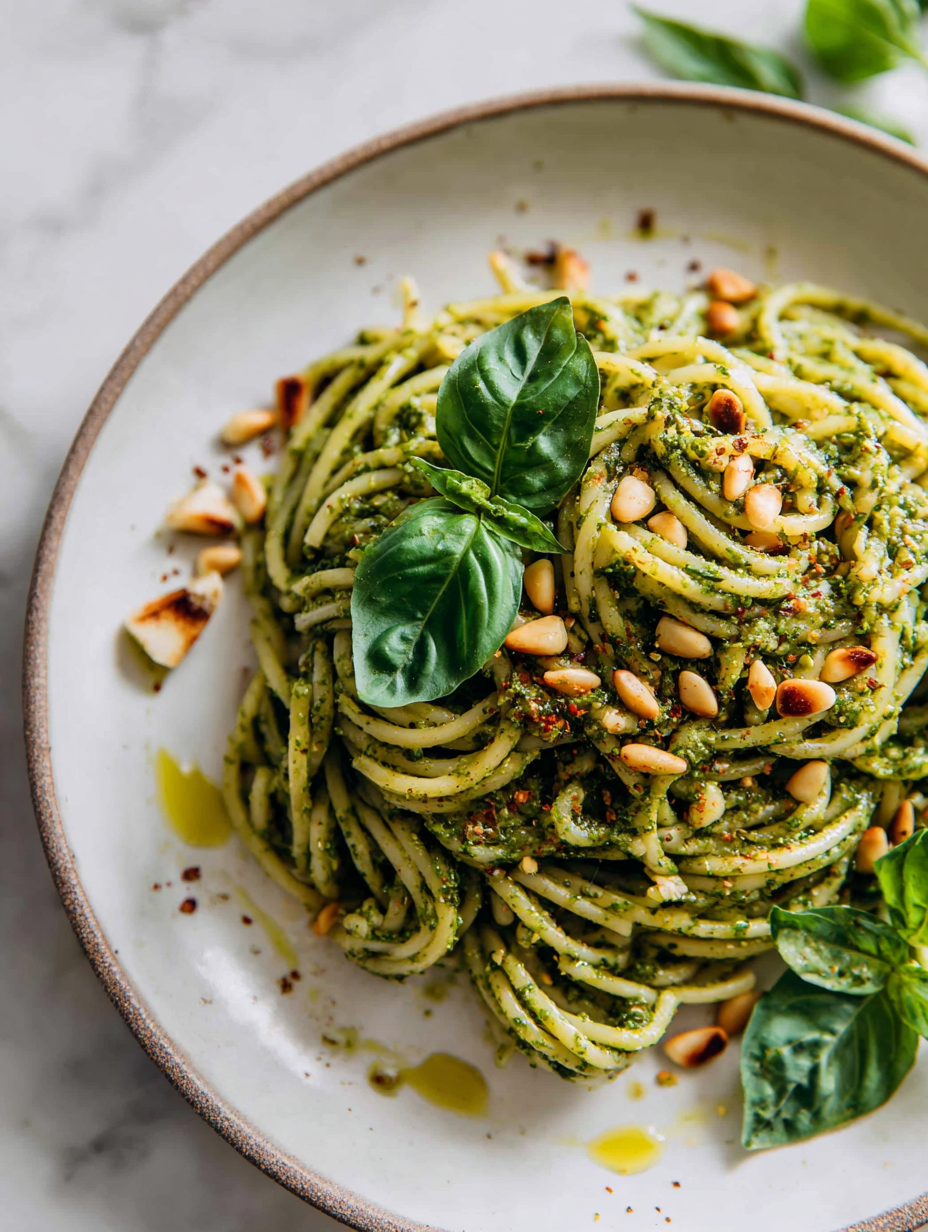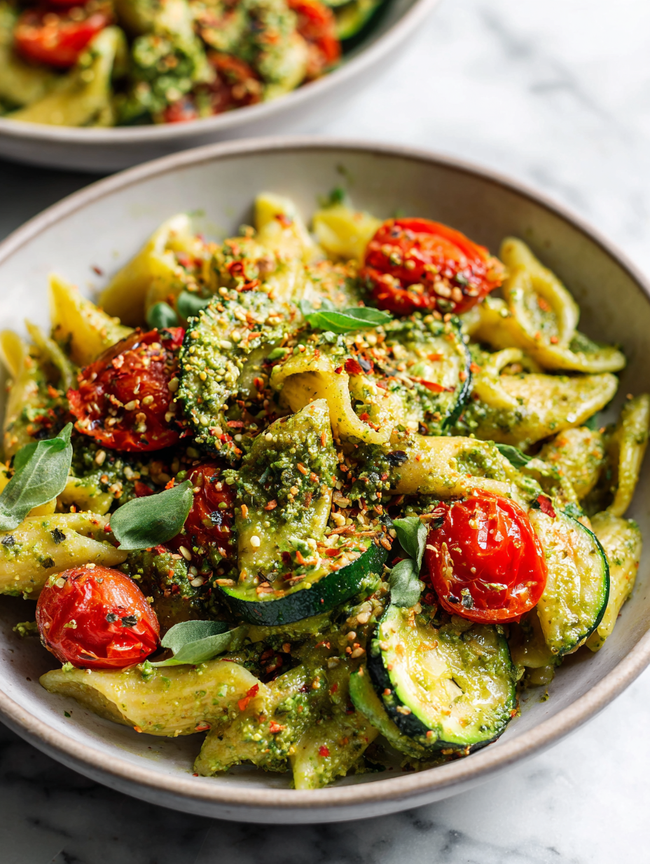 This vegan pesto pasta is a playful twist on the classic, turning it into a bright, herbaceous dish that feels ...