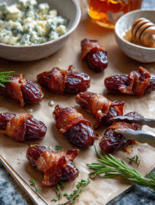 - Wrap each stuffed date with a strip of bacon, securing it with a toothpick to hold everything in place.