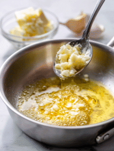 - Add the minced garlic to the butter and cook for about 30 seconds until it becomes fragrant and slightly golden.