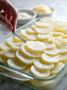 - Arrange a layer of potato slices in the prepared baking dish, overlapping slightly, creating an even layer across the bottom.