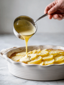Step 7: Pour the creamy mixture over the potatoes, ensuring even coverage.
