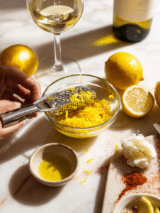 Step 3: Mix a marinade of lemon zest, garlic, smoked paprika, and a splash of white wine.