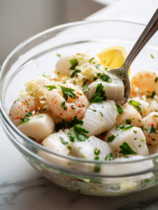 - Place the seafood in a large bowl and pour over the marinade, tossing gently to coat. Let it marinate for about 15 minutes, allowing the flavors to infuse.