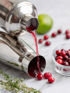 Step 2: In a shaker, combine vodka, cranberry juice, lime juice, and a handful of fresh cranberries.