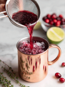 - Strain the mixture into the prepared copper mug, pouring over the ice, and catching any cranberry seeds or pulp.