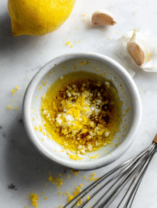 - In a small bowl, whisk together olive oil, lemon zest, lemon juice, and minced garlic to create a vibrant marinade.