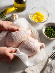 - Pat the chicken breasts dry with paper towels—this helps achieve a crispy skin and ensures even browning.