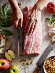 - Spread the apple and sage stuffing evenly over the inside of the pork loin, leaving a small border at the edges.