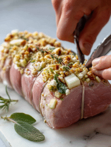 - Carefully roll up the roast, enclosing the stuffing inside, and tie it securely with kitchen twine at 1-inch intervals to keep the shape intact.