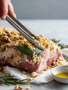 - Preheat your oven to 180°C (350°F). Prepare your ingredients by peeling and dicing the apples, chopping the sage, mincing the garlic, and zesting the lemon. Mix the apples, sage, garlic, lemon zest, breadcrumbs, nuts, olive oil, melted butter, rosemary, salt, and pepper in a bowl to form the stuffing.