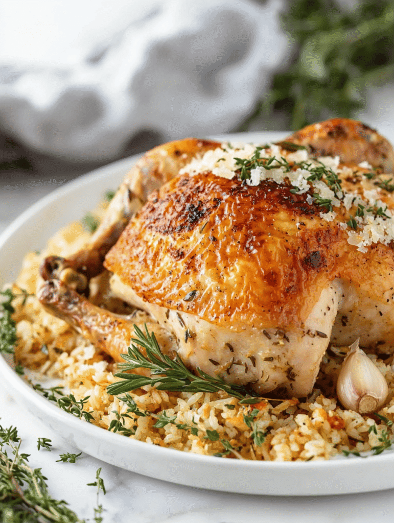 Garlic Herb Roast Chicken with Parmesan Crispy Rice