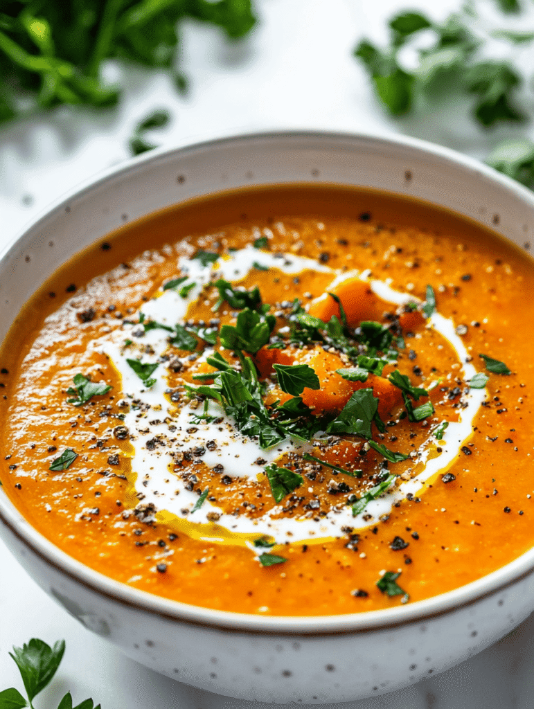 - Serve the soup in bowls, optionally garnished with a drizzle of olive oil or fresh herbs for added flavor and visual appeal. The soup should be smooth, with a rich orange color and a comforting aroma.