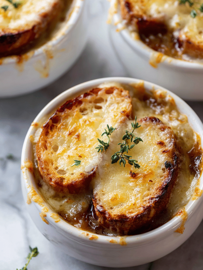 Allow the soup to rest for 2 minutes after broiling. Serve directly in bowls, ensuring cheese is gooey and golden. Garnish with a sprig of thyme if desired for a fresh herbal note.
