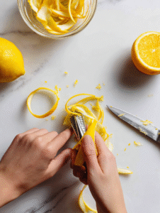 - Use a citrus zester to peel strips of zest from the oranges and lemons, avoiding the bitter pith, and set aside.