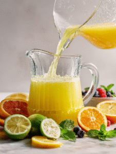 - Measure out the fresh citrus juice and pour it into a large pitcher, filling it about halfway.