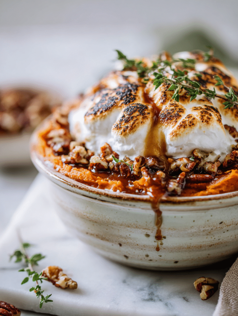 - Serve warm, with the glossy marshmallow peaks and crunchy pecan topping creating a delightful contrast. Enjoy this festive, comforting dish that’s perfect for special occasions.