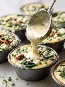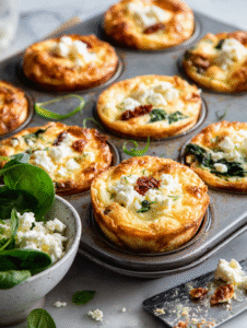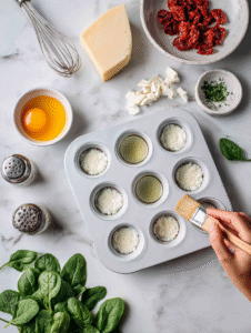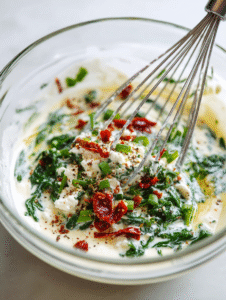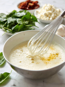 - Add chopped spinach, crumbled feta, and chopped sun-dried tomatoes to the egg mixture. Gently fold to combine everything evenly.