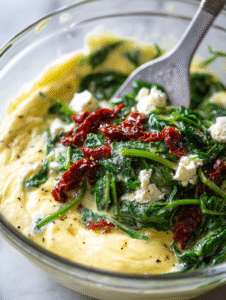 Step 4: Add chopped spinach, crumbled feta, and chopped sun-dried tomatoes.