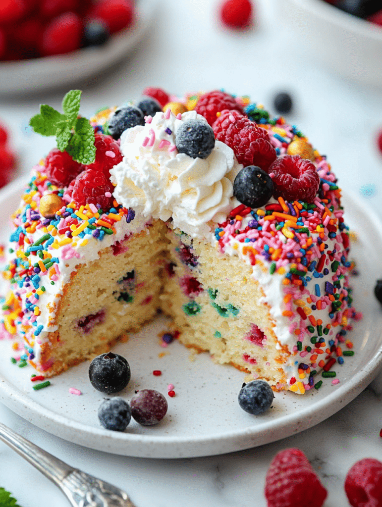 - Slice into portions to reveal the fluffy interior with colorful sprinkles randomly distributed throughout. Serve as is or with a dusting of powdered sugar or a drizzle of glaze.