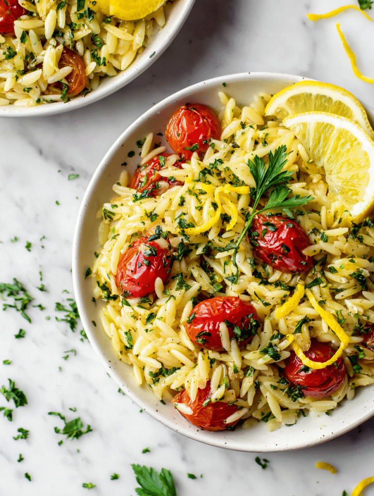 - Serve the vegan lemon herb orzo hot, garnished with extra herbs or lemon zest if desired. Enjoy this cozy, bright, and hearty meal straight from the skillet.